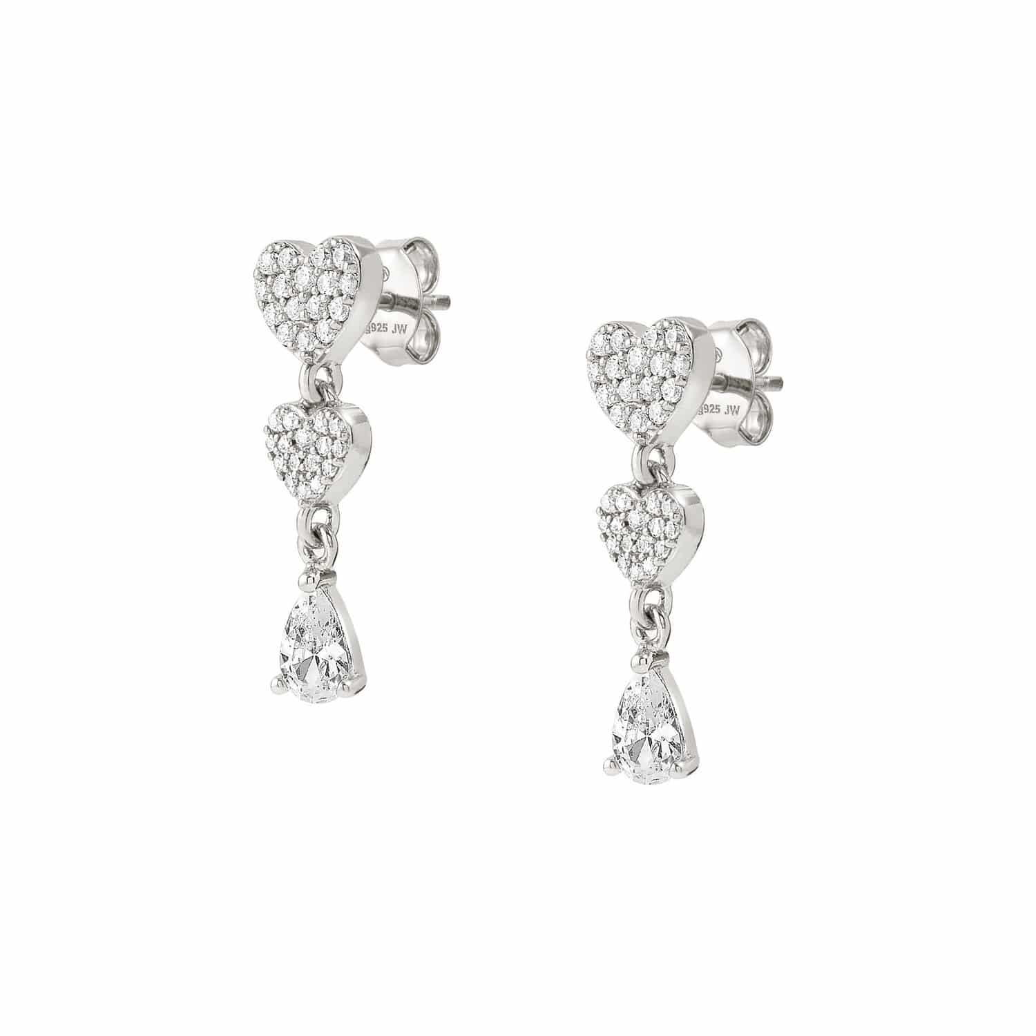 Orecchini in argento 925 rodiato da donna di Nomination con cuori pendenti formati da zirconi bianchi.