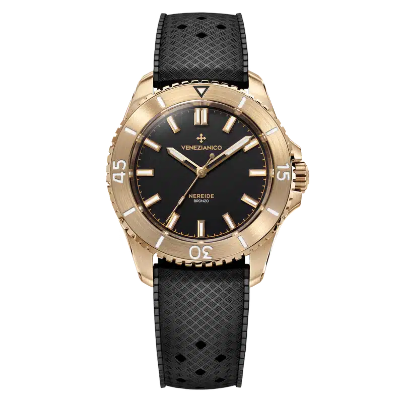 Linee scolpite e materiali che raccontano una storia definiscono il Venezianico Nereide Bronzo 3121555. La cassa da 39 mm in bronzo marino QAl9‑4 sviluppa nel tempo una patina unica, trasformando ogni esemplare in un pezzo personale e irripetibile. Il quadrante nero opaco, pulito e leggibile, si abbina alla ghiera unidirezionale in bronzo, creando un’estetica compatta e dal carattere deciso. Al suo interno lavora il movimento automatico Miyota 9039, affidabile e preciso, protetto da un fondello inciso con i Cavalli di San Marco, omaggio alla tradizione veneziana.