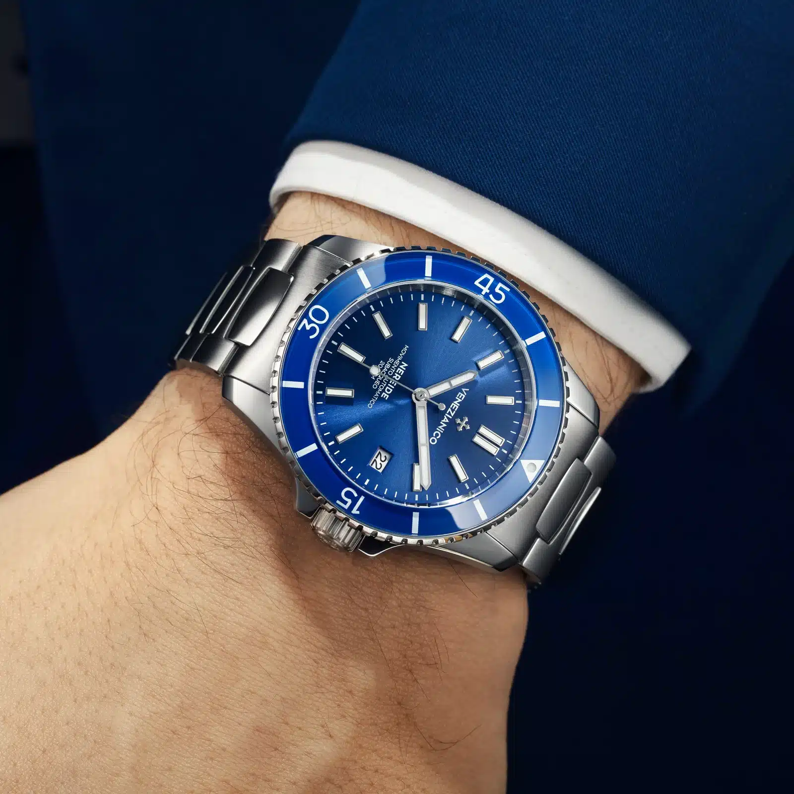Il Venezianico Nereide 3321502C colpisce per il suo affascinante quadrante blu abbinato alla ghiera girevole tono su tono, creando un look marino elegante e deciso. Con cassa da 42 mm in acciaio e movimento automatico Seiko NH35A, è l’orologio ideale per chi cerca stile, funzionalità e un’identità forte ispirata al mondo subacqueo.