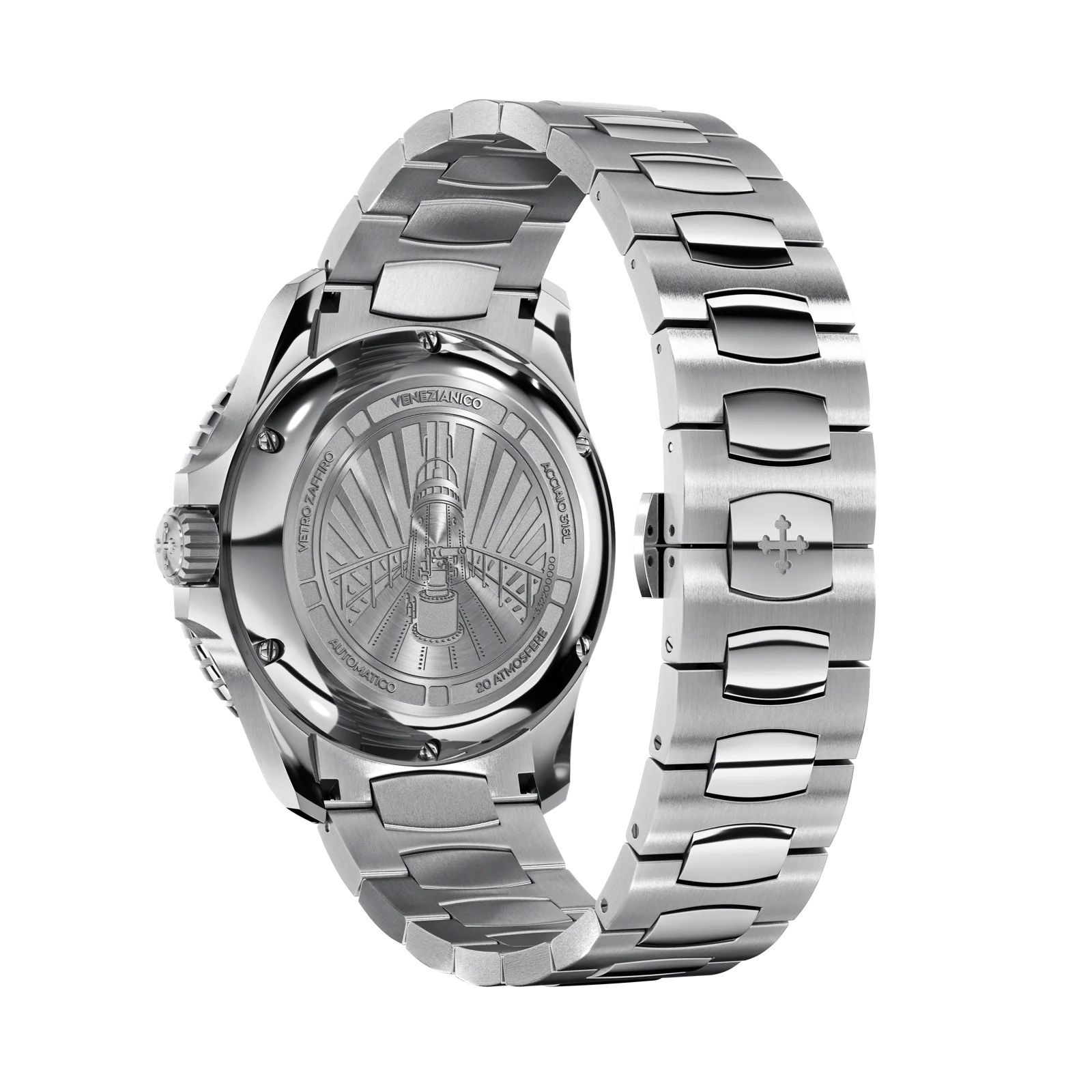 MATERIALE CASSA: Acciaio 316L DIMENSIONI: Ø42 mm, da ansa ad ansa 49.00 mm MOVIMENTO: Cal. Seiko NH35A Automatico VETRO: Vetro in zaffiro con trattamento antiriflesso PIGMENTO LUMINESCENTE: BGW9 Super-LumiNova® GHIERA: Inserto in vetro BK7, 120 scatti RESISTENZA ALL’ACQUA: 20ATM (= 200mt) BRACCIALE: Canova