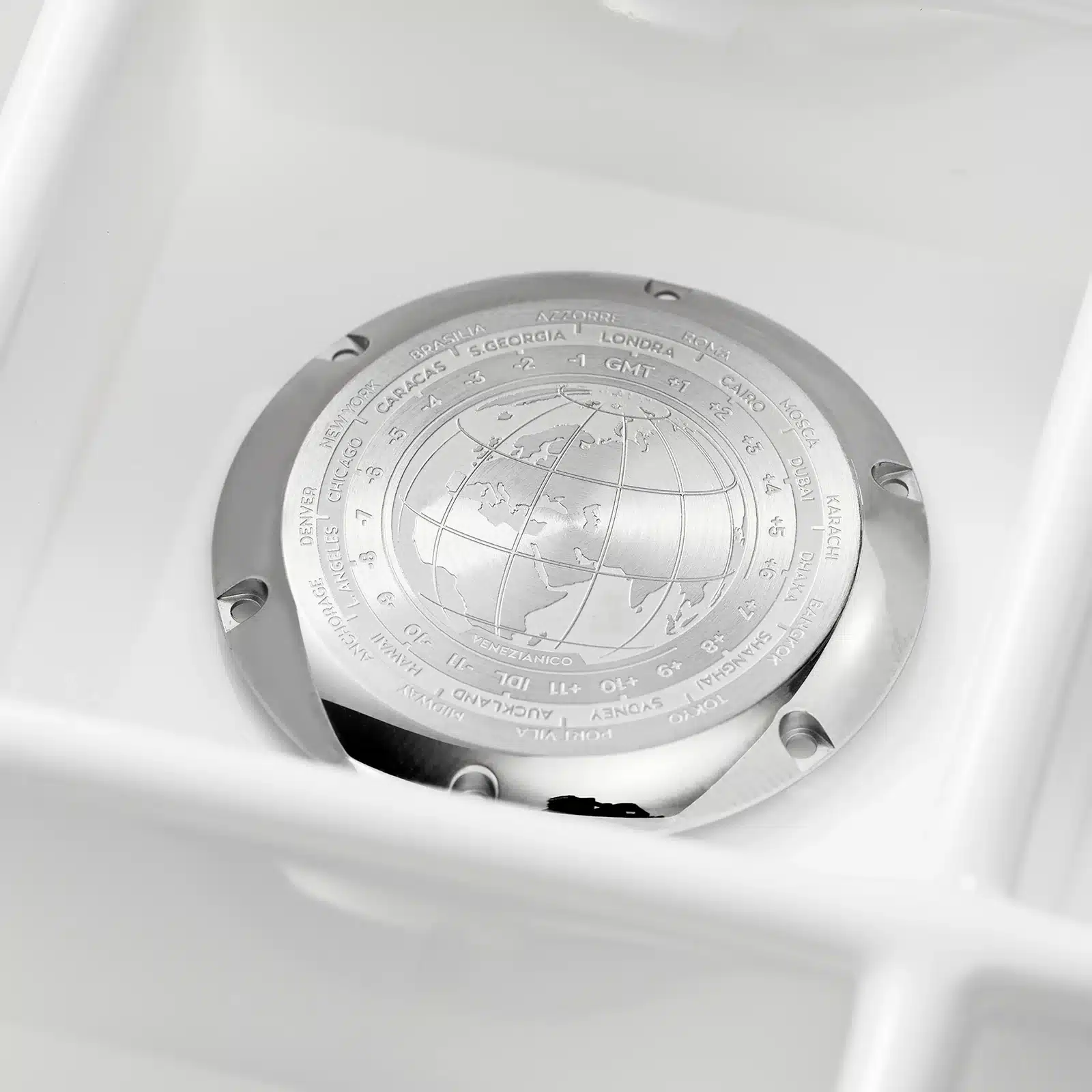 Il Nereide GMT 3521504C unisce eleganza e funzionalità in un orologio da 39 mm che si distingue per il suo quadrante blu intenso e la lunetta bicolore blu e grigia in vetro zaffiro. Il cuore pulsante è il calibro automatico Seiko NH34A, affidabile e preciso, con funzione GMT per i viaggiatori moderni. Uno stile raffinato ispirato al mondo nautico, firmato Venezianico.