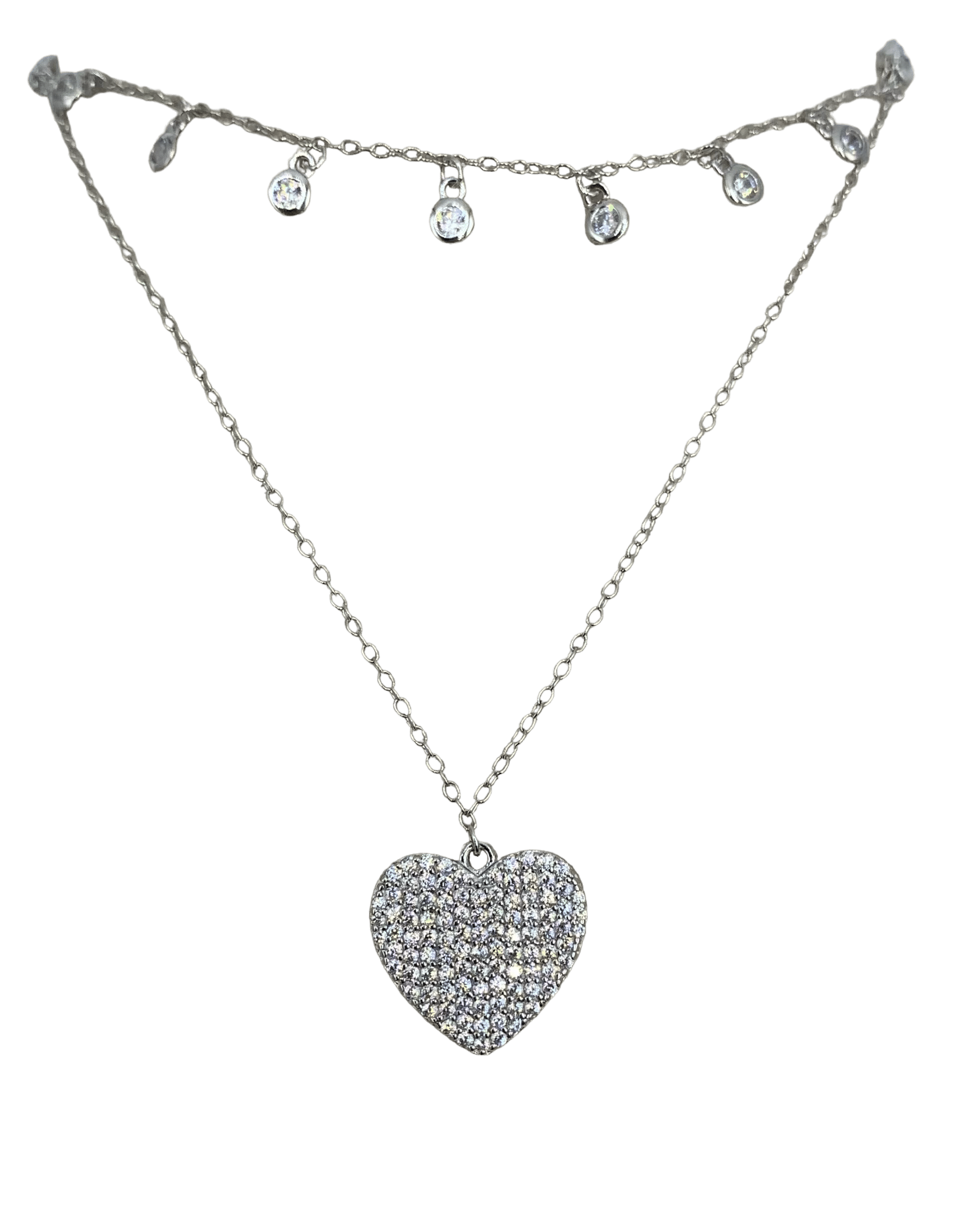 Collana in argento 925 rodiato con un cuore pendente formato da zirconi extra-bianchi e da un filo di zirconi extra bianchi pendenti.