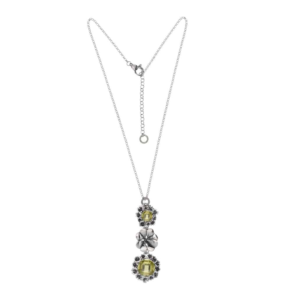Il pendente presenta due gemme gialle dal taglio brillante, incastonate in una montatura circolare in argento brunito, una lavorazione che dona profondità e un raffinato effetto vintage. Tra le due gemme si inserisce un elegante quadrifoglio in argento, che richiama il tema del quadrifoglio reinterpretato in chiave moderna e femminile.
