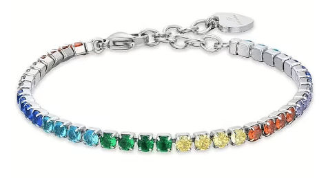 Il bracciale tennis BK2634 di Luca Barra è un gioiello che celebra la diversità e la gioia di vivere. Realizzato in acciaio anallergico 316L, è impreziosito da una sequenza di cristalli multicolore che creano un effetto arcobaleno luminoso e vivace. La lunghezza regolabile di 15 + 3 cm garantisce una vestibilità confortevole per ogni polso. Perfetto per aggiungere un tocco di colore al tuo look quotidiano o per occasioni speciali. Confezionato in elegante scatola originale Luca Barra, è ideale anche come idea regalo.