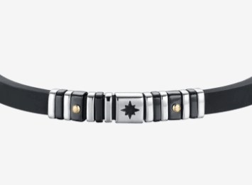 Bracciale in silicone nero da uomo con elementi in acciaio e IP rosa con al centro una raffigurazione della rosa dei venti.