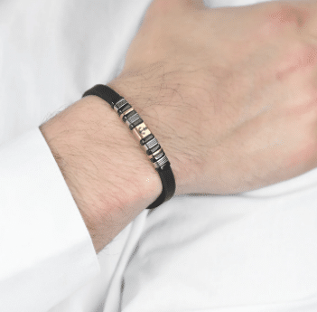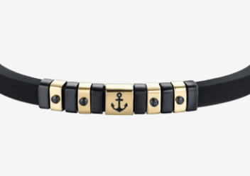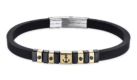 Bracciale in silicone nero da uomo con elementi in IP gold e nero con al centro un’ ancora.