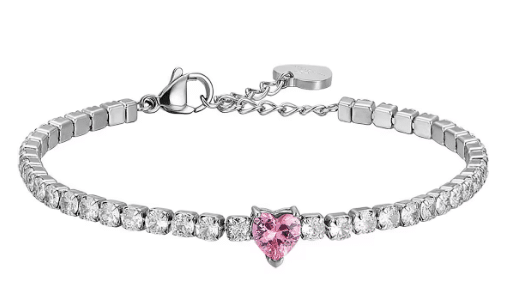 Romantico e luminoso, il bracciale Luca Barra BK2281 è realizzato in acciaio e impreziosito da cristalli bianchi che accompagnano un delicato cuore centrale in cristallo rosa. Un gioiello elegante e femminile, perfetto per aggiungere un tocco di dolcezza a ogni look.