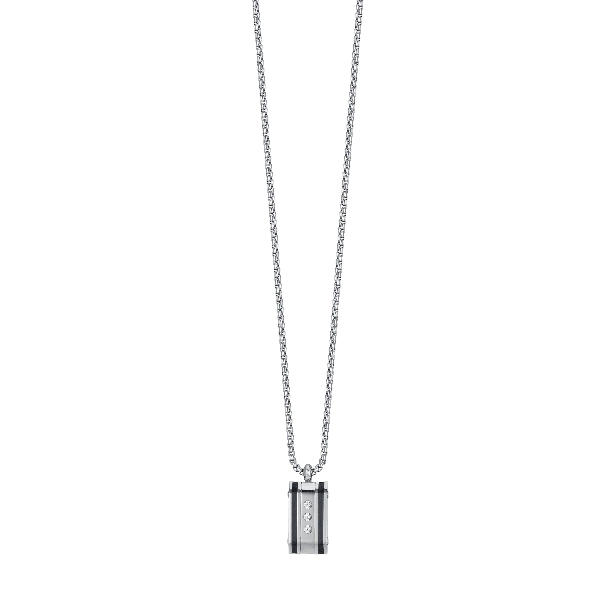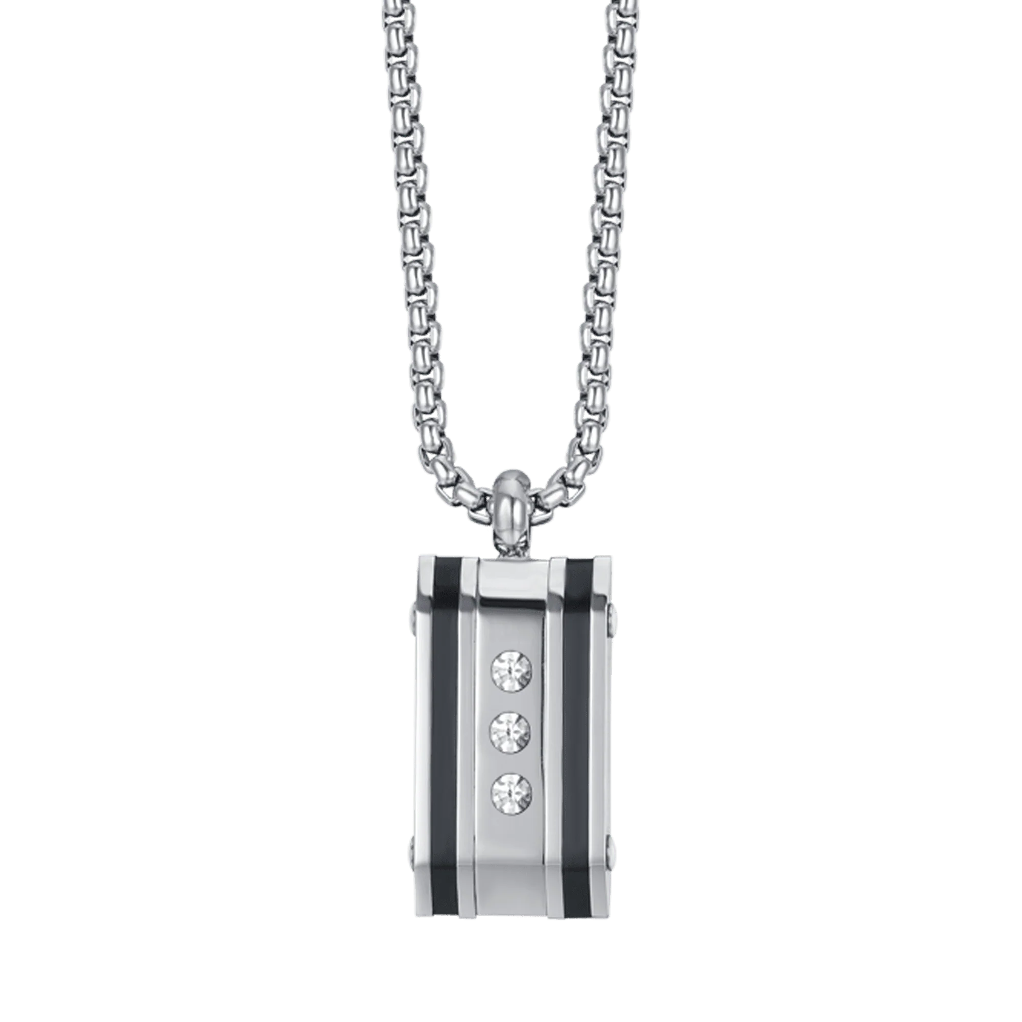 La collana uomo Luca Barra CA452 è un gioiello raffinato e moderno, perfetto per valorizzare ogni look maschile con un tocco di classe. Realizzata in acciaio inossidabile lucido, si distingue per il pendente rettangolare impreziosito da tre cristalli bianchi incastonati verticalmente, che creano un contrasto elegante con le finiture scure del metallo.