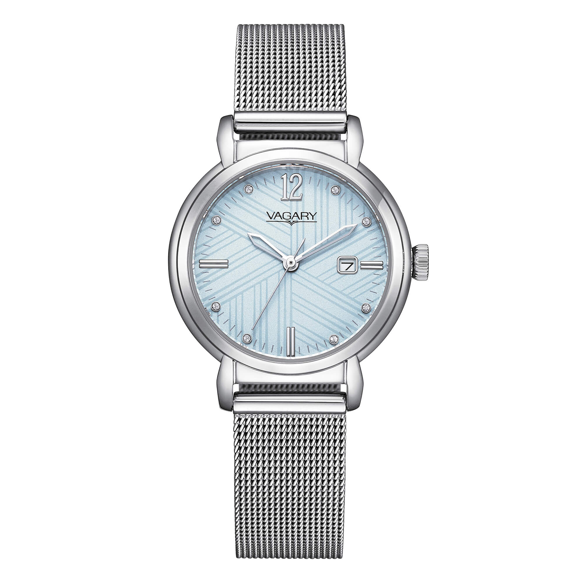 Scopri l’eleganza contemporanea dell’orologio da donna Vagary IU3-410-71 Flair Lady, pensato per chi ama uno stile raffinato ma moderno. Questo splendido segnatempo si distingue per il design minimal-chic, caratterizzato da un cinturino in maglia milanese (mesh) in acciaio inox e un quadrante azzurro con texture geometrica, impreziosito da indici con cristalli e datario a ore 3.