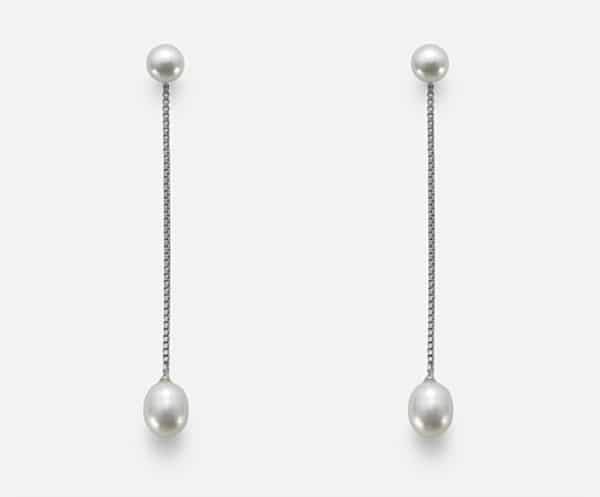 Orecchini Mikiko in argento 925 con doppia perla coltivata d’acqua dolce. Al lobo, una perla Botton da 7,5/8 mm offre eleganza discreta, mentre una perla pendente di forma allungata da 9/9,5 mm aggiunge movimento e raffinatezza. Un design sofisticato e armonioso, ideale per chi ama uno stile classico con un tocco moderno.