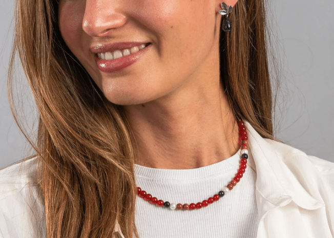 Riflessi del Deserto e dell’Oceano, onice rossa e perle ti aiuteranno a ritrovare l’energia donandoti forza e benessere.